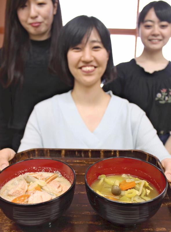 Aomori University of Health and Welfare is encouraging its students to have a bowl of miso soup with many ingredients for breakfast. The university, nearly half of whose students are non-Aomori Prefecture natives, began the campaign after finding out many were anemic because they don't cook on their own and therefore often skip breakfast.