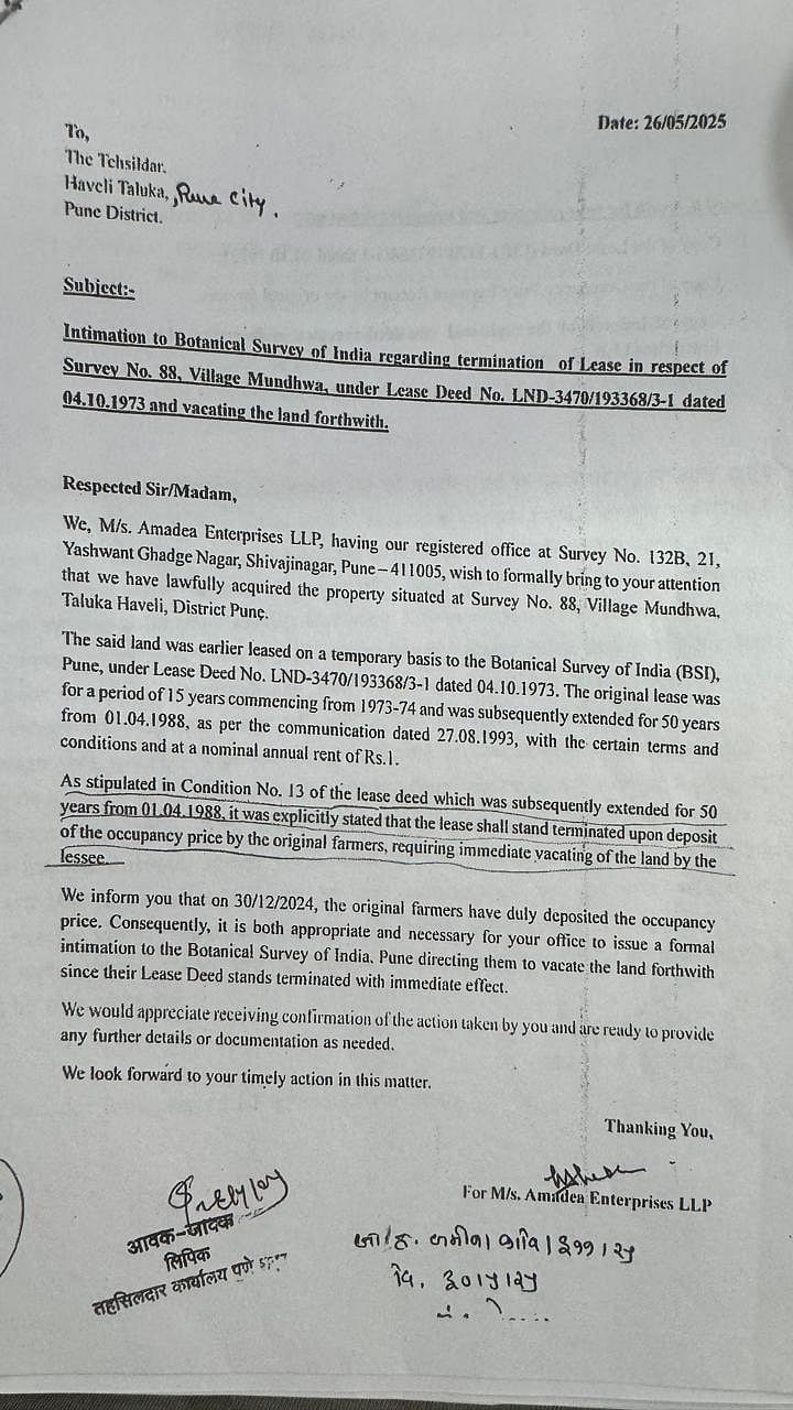 But on May 20, the sale deed was executed and on May 26, Amadea Enterprises wrote to the Tehsildar informing them that they had occupied the land legally and BSI should evacuate the land. The letter stated, “We inform you that on December 30, 2024, the original farmers have duly deposited the occupancy price. Consequently, it is both appropriate and necessary for your office to issue a formal intimation to the Botanical Survey of India, Pune directing them to vacate the land forthwith since their lease deed stands terminated with immediate effect.”