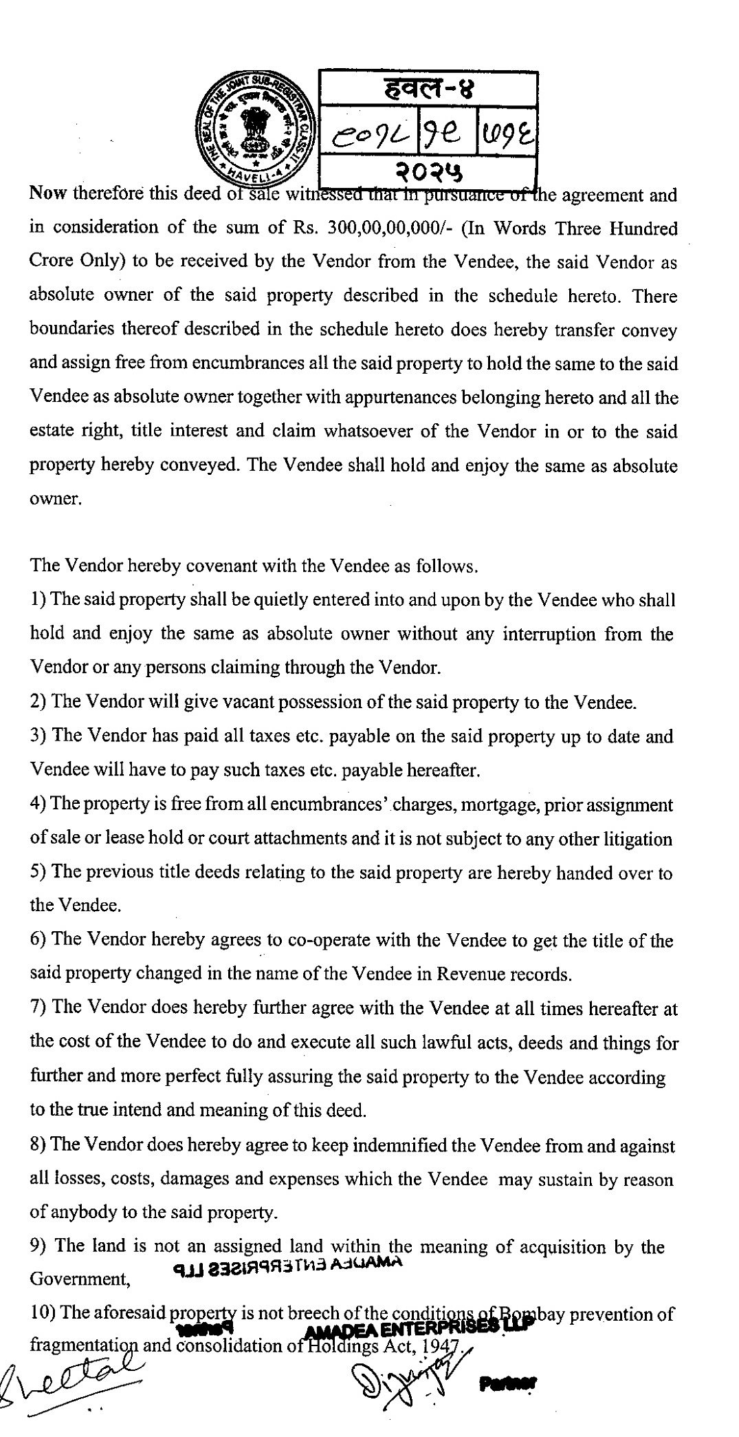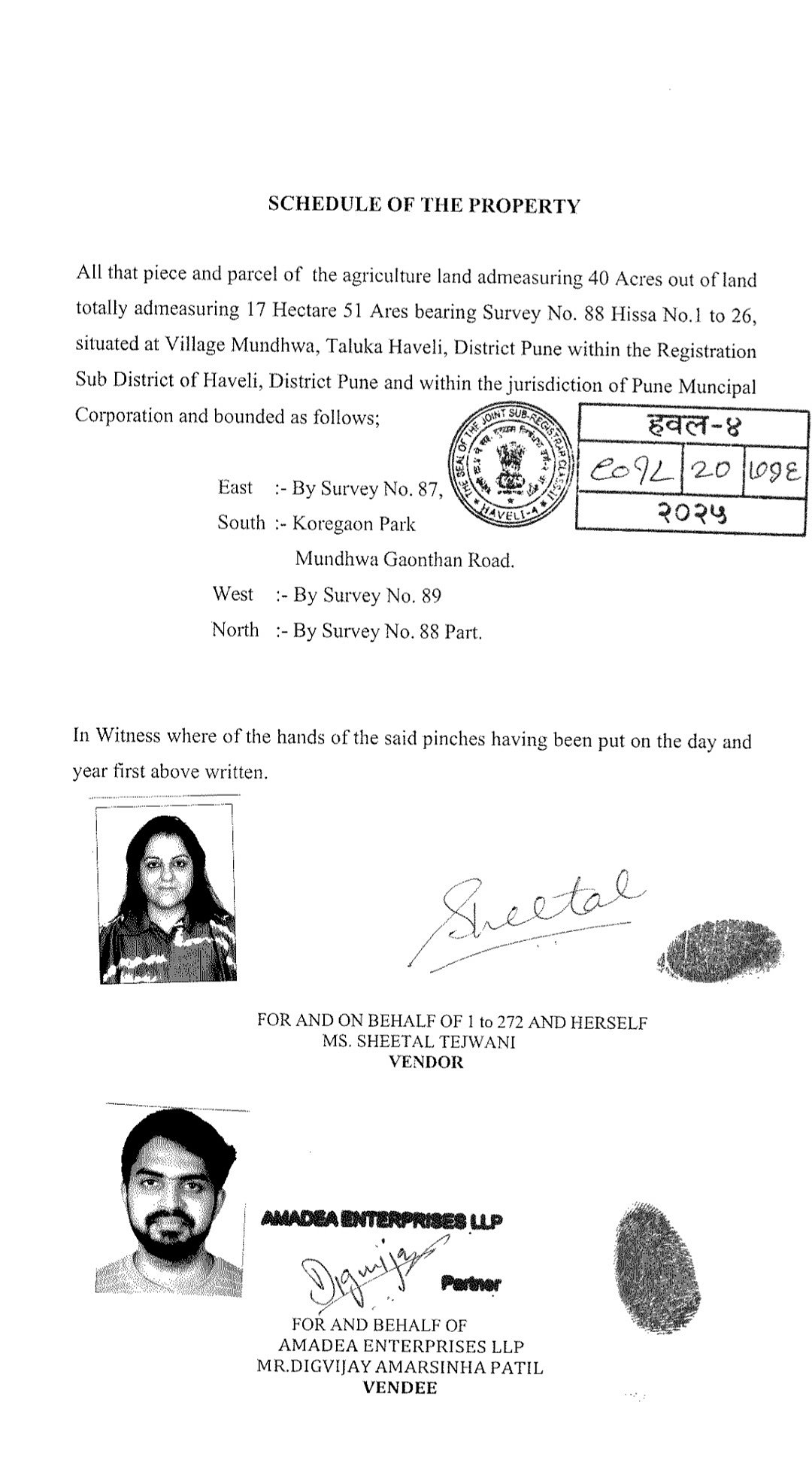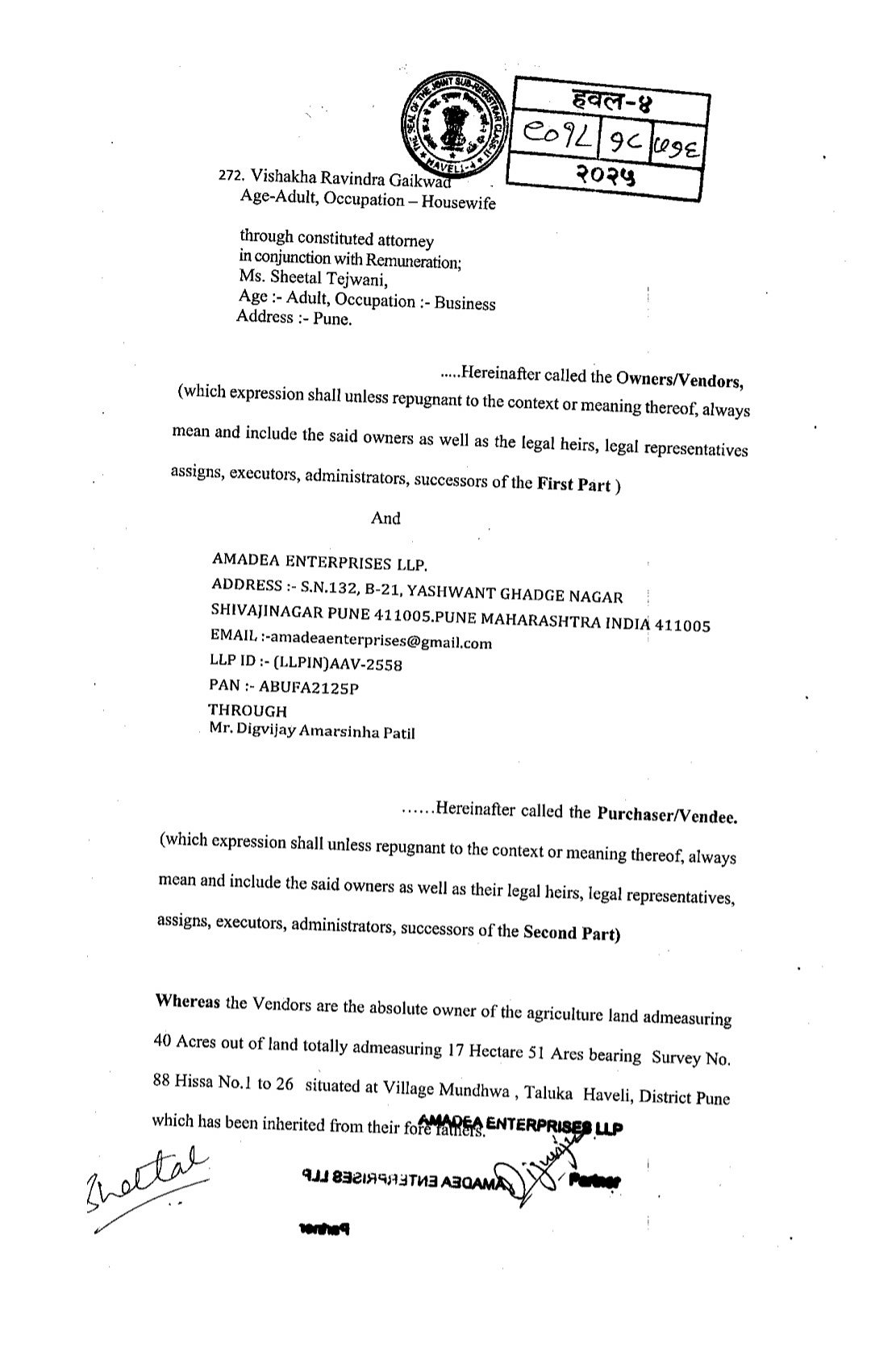 On May 20, 2025, a sale deed was registered between 272 members of the Mahar Gaikwad families and Amadea Enterprises LLP. In the Index-2 of the document, Sheetal Tejwani is listed as the representative of the 272 members of Gaikwad clan, while the company was represented by Digvijay Singh Patil, Parth Pawar’s cousin and a 1 percent partner in the firm.