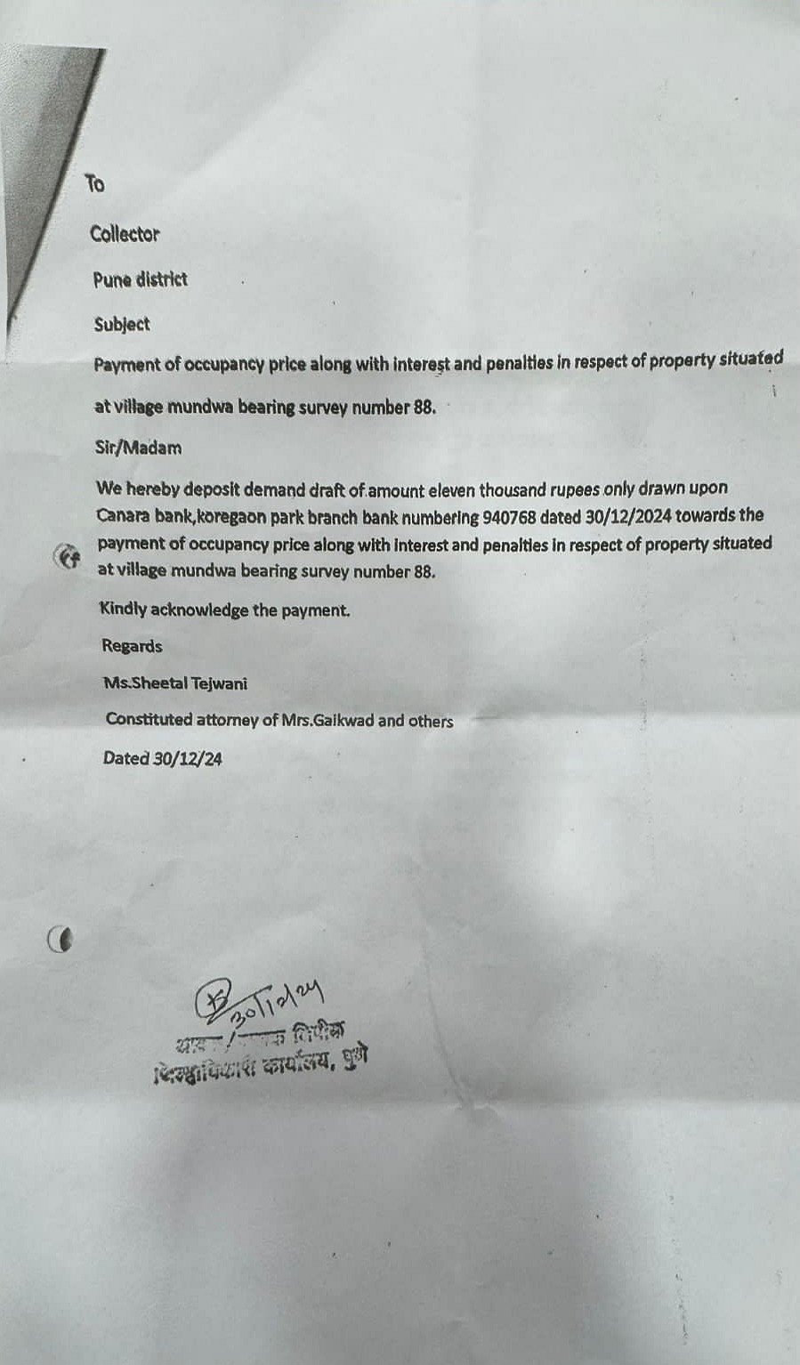 While the land scam came to light in November 2025, the motion to set it in place began almost 11 months back in December 2024, when Tejwani submitted a letter with signed power of attorney to Pune’s collector. It claimed that a demand draft worth Rs 11,000 had been submitted for the regrant of the land and the land should be handed over to the original Watandars. This was for the land bearing survey number 88, leased to the BSI.
