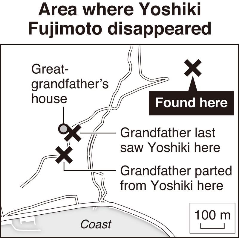 After walking about 100 meters, Yoshiki returned to the house by himself. His grandfather watched him walk back to near the house, but the boy went missing after that. About 150 searchers, including police officers and firefighters, looked for the boy.