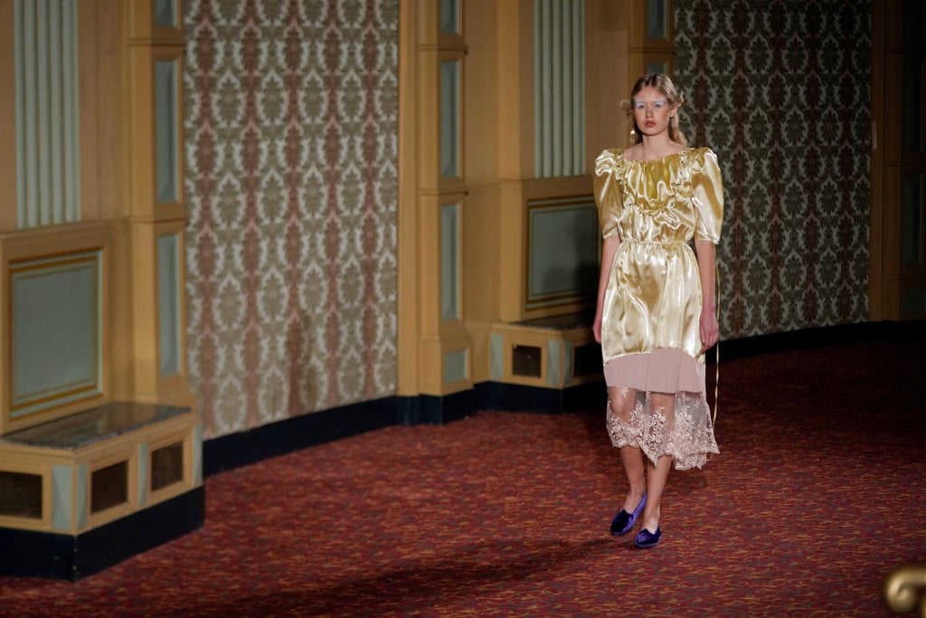 Still, the collection offers a hopeful message. She took inspiration from figurative paintings representing the four Christian evangelists as a lion, an eagle, a bull and an angel in the apse of St. Michael’s church in Ferrara. The deconsecrated church, originally built in the Middle Ages and reconstructed in the Renaissance, is the permanent home of works by sculptor Bruno Liberatore, the designer’s father.