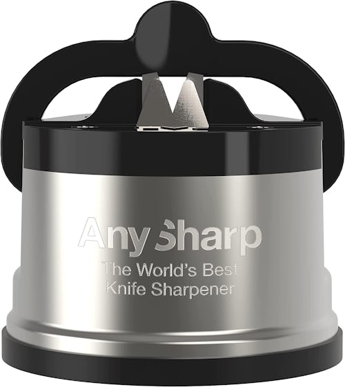 Keep your blades in top-notch condition with this efficient knife sharpener. Its patented design features tungsten carbide, which helps to extend the lifespan of just about any knife. Just attach its hands-free suction cup base to your kitchen counter, and since it uses no electricity, you can sharpen your knives anytime you need to for years to come.
