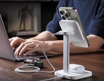 Power up multiple devices at once with this wireless charger. It's equipped with potent charging chips that get your phone and AirPods to 100 percent battery super fast. It also protects against hot temperatures and high voltages, and its nonslip design keeps it in place on your desk or nightstand. You can use it as a phone stand while it works too, horizontally or vertically.