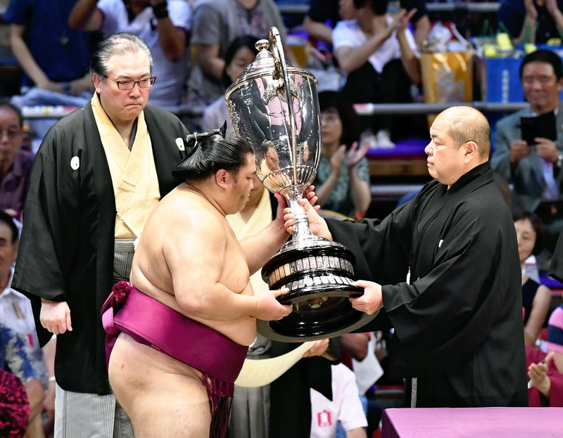 Sekiwake Mitakeumi finished up the tournament he had already won, not so much with a bang as a thud -- the sound of him landing hard after being thrown down by No. 9 maegashira Yutakayama.