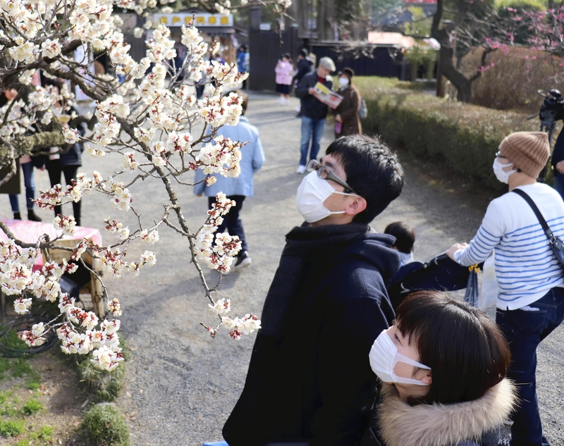 MITO -- Kairakuen, a garden famous for its plum trees in Mito, the capital of Ibaraki Prefecture, began its annual Mito Plum Festival on Feb. 15. Due to the widespread outbreak of the new coronavirus, hand sanitizer has been made available for use at the ticket gate and many visitors could be seen wearing surgical masks. The masks were made compulsory for the junior high school student volunteers who help sightseers at the event, after the executive committees of both the municipal and Ibaraki Prefectural governments were pressed to introduce infection prevention measures.