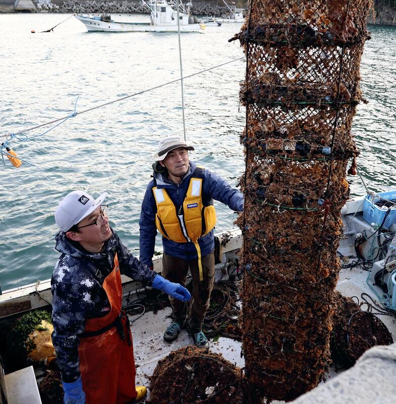 Wine bottles in oyster farming baskets covered in seaweed were pulled onto boats in Shizugawa Bay, Minami-Sanriku, in late April. The wine had been aging under the sea for six months at a depth of about 10 meters in a unique method called under-the-sea aging.