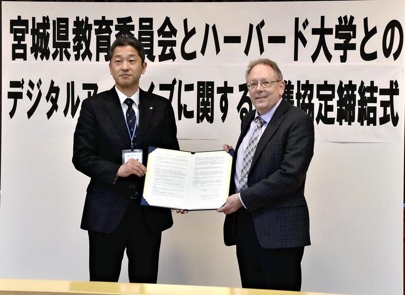 SENDAI -- Miyagi Prefecture's Board of Education has formed a partnership with Harvard University to share 220,000 items and documents related to the Great East Japan Earthquake. The agreement was made official on Feb. 27, with the fervent hopes that the cruel lessons from the disaster will not fade away with the passage of time, and that the agreement will contribute to both disaster mitigation and prevention education.