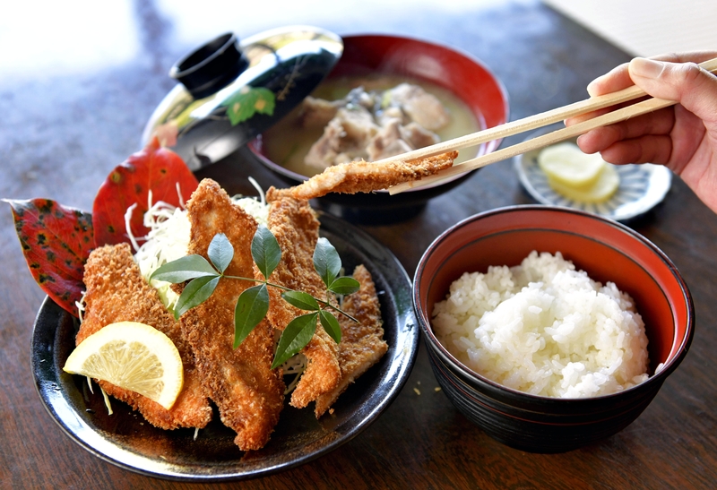 The restaurant mainly uses 3-year-old male sturgeon measuring 60-90 centimeters long. I ordered a fried sturgeon set meal. The white meat of this freshwater fish was chewy. The dish comes with four or five pieces of fried fish along with carp in miso soup for 1,260 yen. The restaurant also sells 23-gram bottles of caviar starting at 8,000 yen.