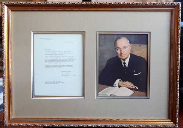 Mantovani likes to collect documents that have a tie to St. Louis. His Harry Truman signature is on a letter Truman wrote to St. Louis Mayor Joseph Darst in May 1952. Truman's thanking Darst for an invitation to a dedication of a housing project but explains he already has an out-of-town engagement. "I hope you will express my regret and inform the people of Saint Louis that they are making progress in low cost housing," Truman writes. He was probably referring to the Cochran Gardens project, which opened that month and was eventually demolished in 2008.