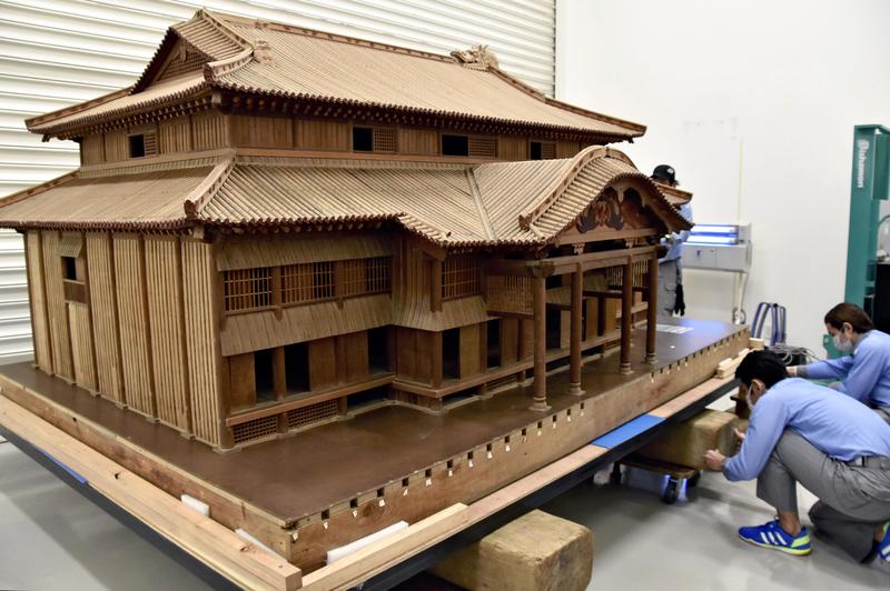 NAHA -- A museum in Naha has started the transfer of a model of the main hall of Shuri Castle to a museum in Tokyo for an upcoming exhibition. This is the first time that the Seiden main hall model will be exhibited outside Okinawa Prefecture.