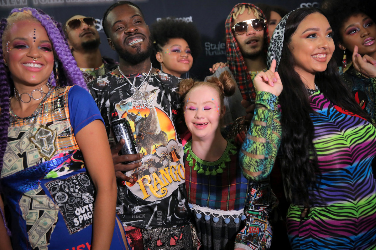 Model Madeline Stuart stands backstage between two male models at New York Fashion Week in New York City, U.S., September 6, 2018. REUTERS/Andrew Kelly