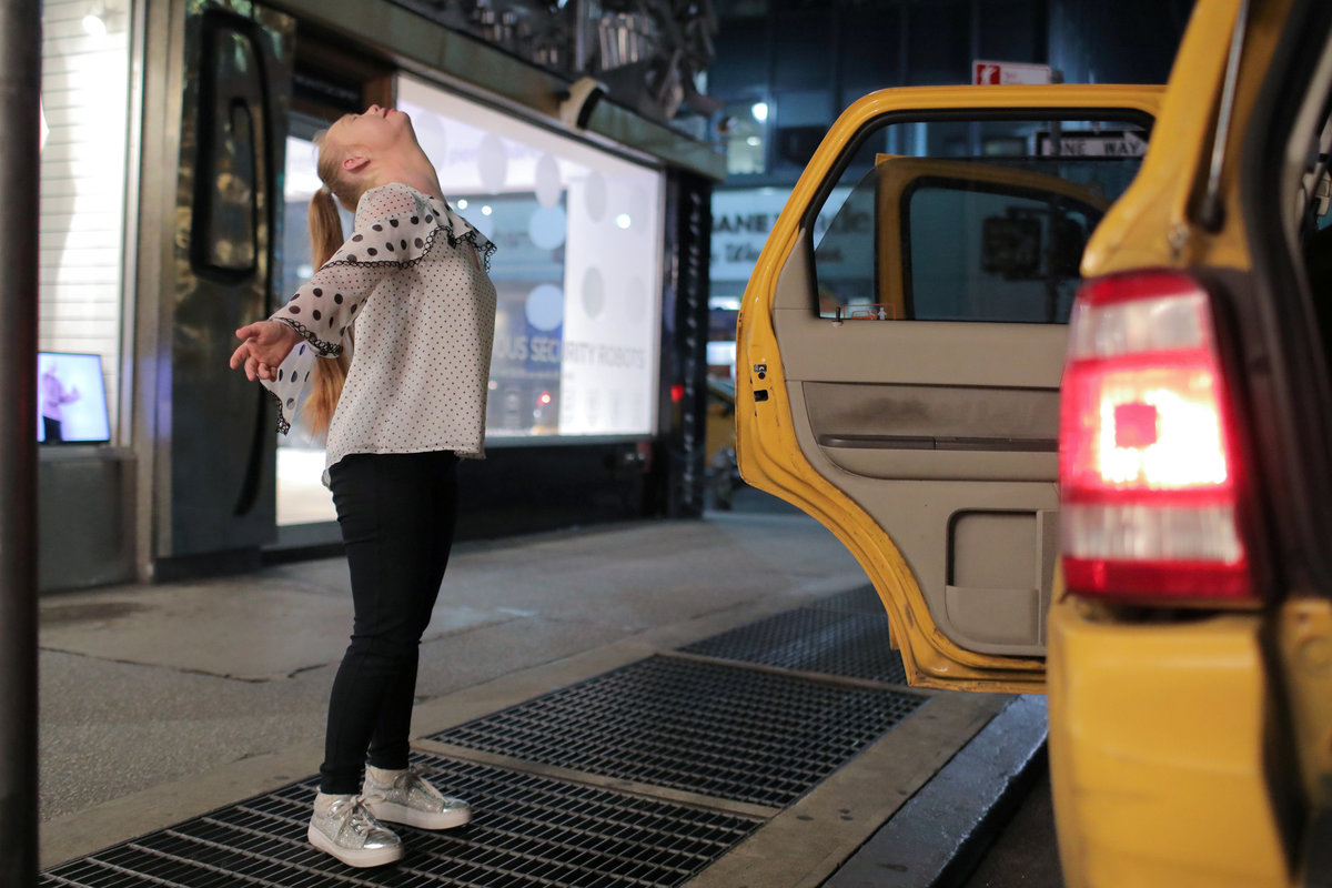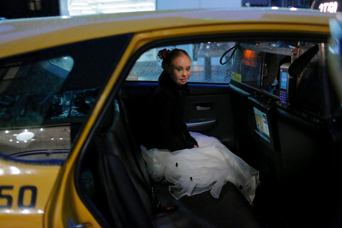 Model Madeline Stuart sits in the back of a taxi cab after walking in a runway show during New York Fashion Week in New York City, U.S., September 9, 2018. REUTERS/Andrew Kelly