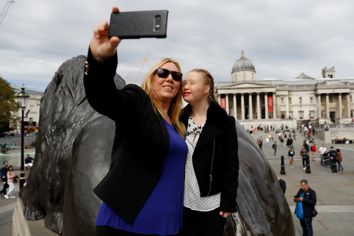 Model Madeline Stuart, who has Down's syndrome, poses for photographs with her mother Rosanne, while sightseeing in Trafalgar Square in London, Britain, September 16, 2018. REUTERS/Peter Nicholls.