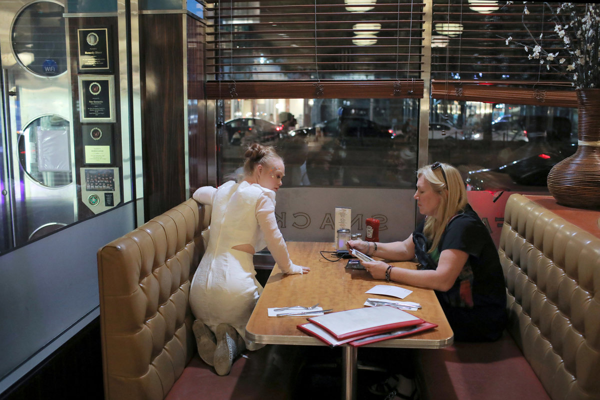 Model Madeline Stuart sits at the Remedy Diner with her mother and manager Rosanne Stuart after walking in a runway show during New York Fashion Week in New York City, U.S., September 6, 2018. REUTERS/Andrew Kelly