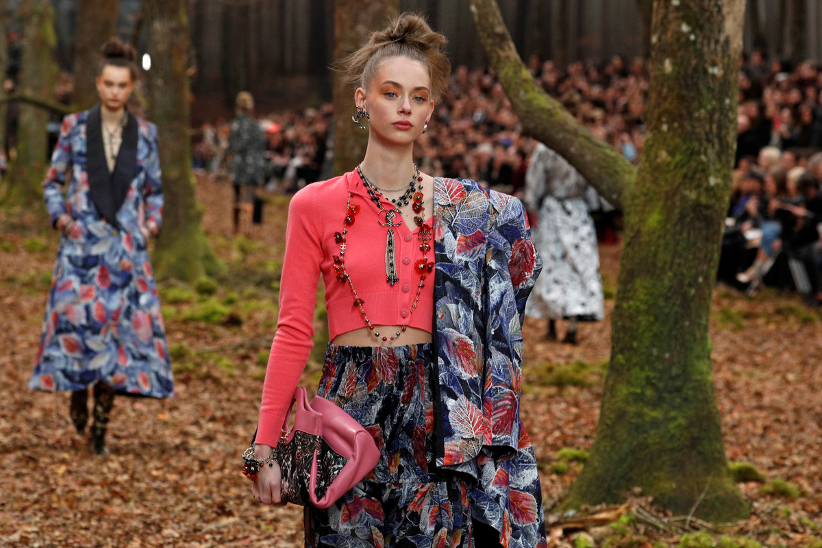 Chanel's famed tweed suits made an appearance, some with longer, narrow skirts for the winter months. And long coats with leafy patterns in combinations of blues and pinks, and others in green with hints of orange, were among the show stealers.