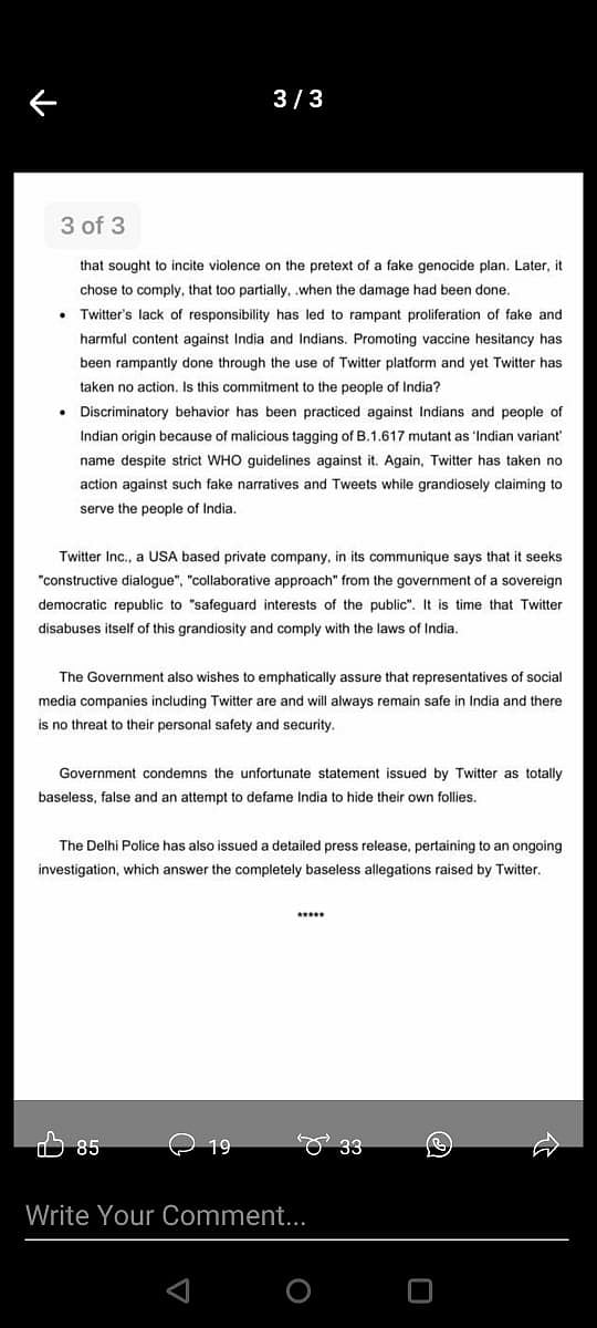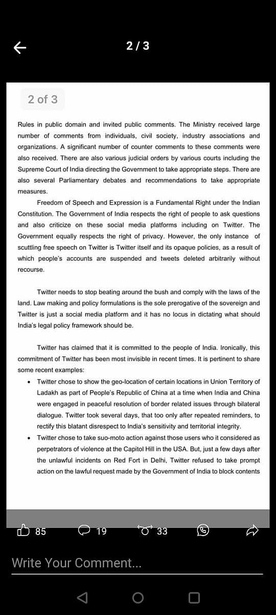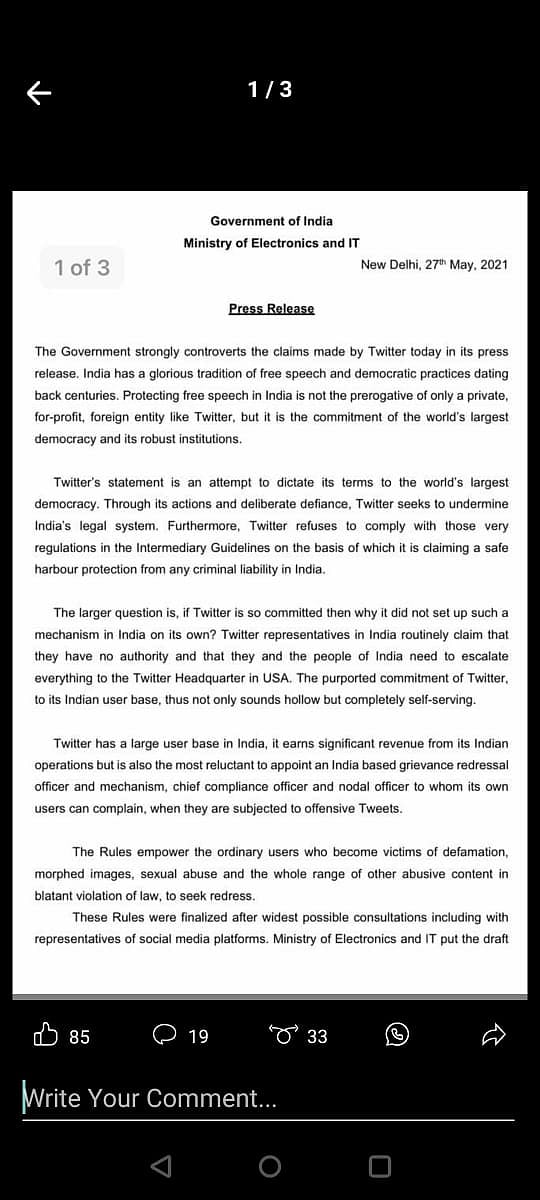 Hours after Twitter issued a statement expressing its concerns about a "potential threat" to freedom of expression in India, the Modi government delivered its response. In a statement, the ministry of electronics and IT accused Twitter of attempting to "dictate its terms to the world's largest democracy".