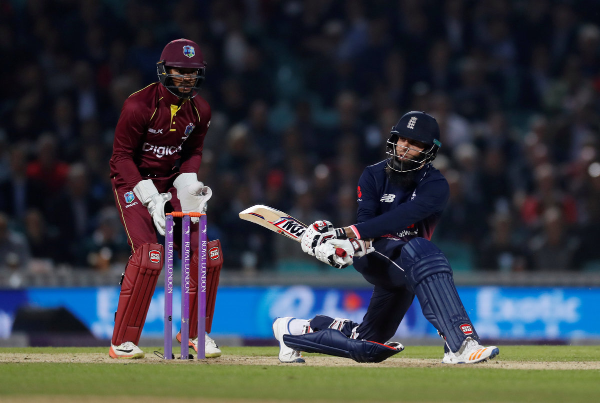 When the weather intervened in the 36th over, England had just scrambled ahead of schedule after a thrilling counter-attack from Moeen Ali (48 not out) and Jos Buttler (43 not out) took them to 258 for five in reply to West Indies' 356 for five.