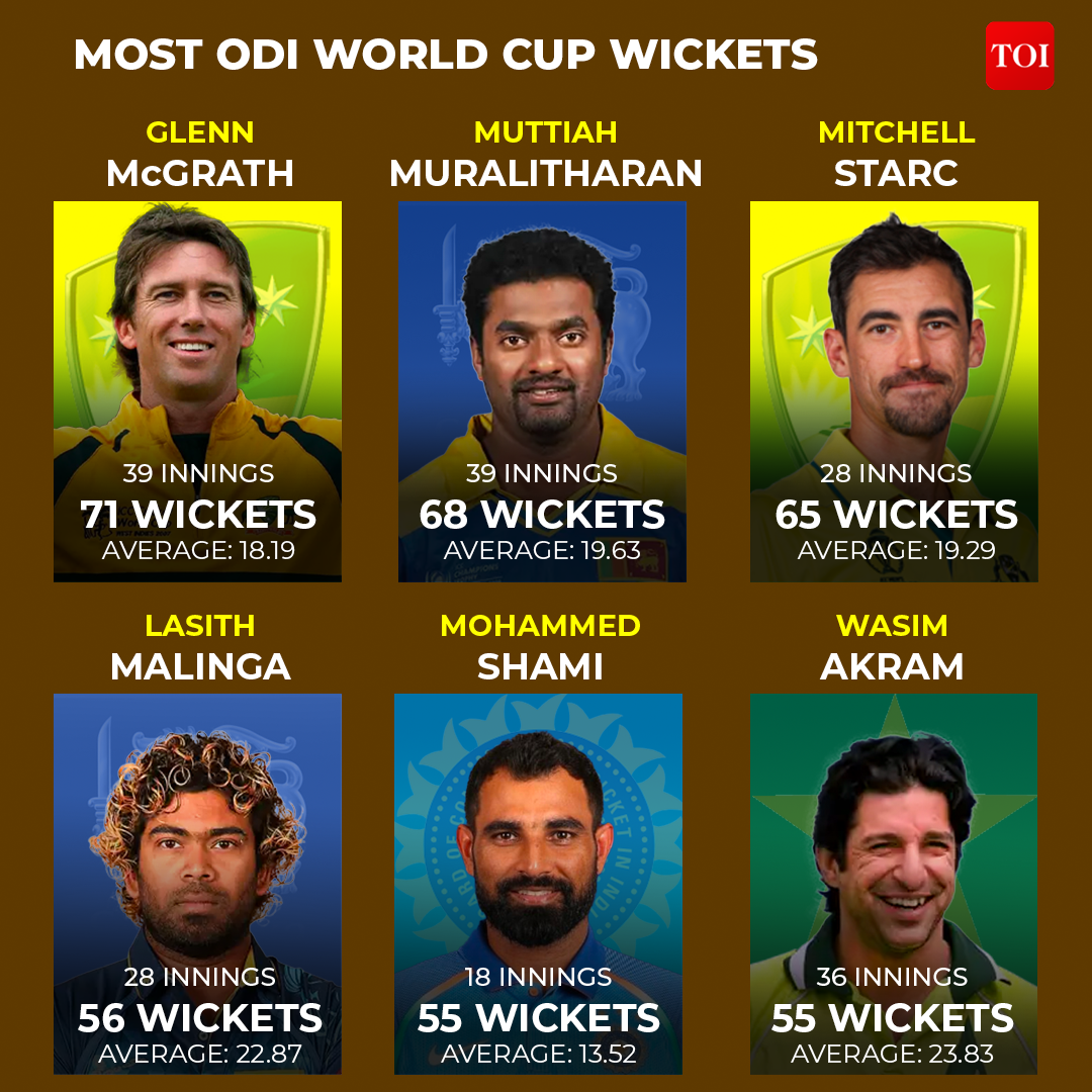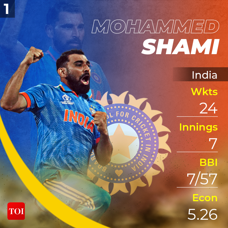 In 18 World Cup matches, Shami has taken 55 wickets at an average of 13.52 and a strike rate of 15.81, with the best figures of 7/57The pacer has taken four five-wicket hauls in his WC career, most by any bowler.Shami is the fifth-highest wicket-taker in tournament history. Australia's Glenn McGrath has the highest wickets in WC history, with 71 scalps in 39 matches.