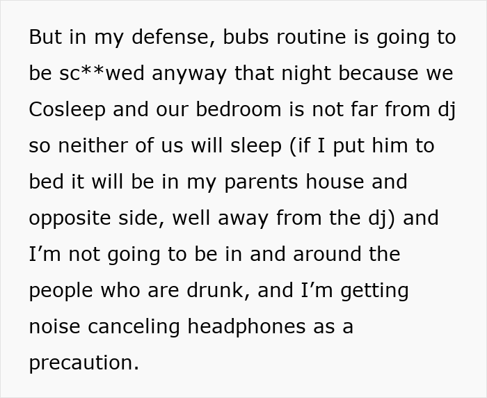 Her partner, however, wasn’t thrilled. He worried about their baby’s hearing, disrupted sleep routine, and being near hundreds of drunk teens. The OP then explained that she planned to use noise-cancelling headphones, stay far from the speakers, and keep the baby on her side of the yard.