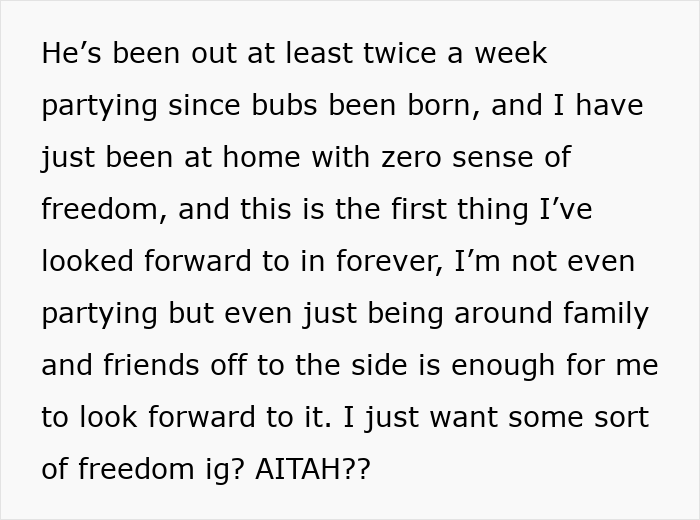 Still, her partner wasn’t thrilled at the idea, and this was where the OP shared that she hadn’t had a night out or even mild social freedom in months, while her partner still went out regularly. Naturally, this left her feeling isolated when all she wanted was to feel human again.