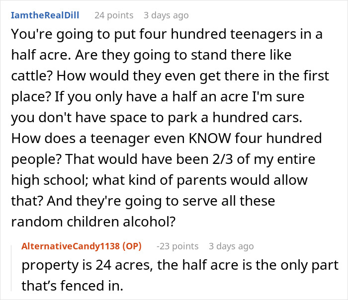 Many netizens were firmly against the OP’s decision, labeling her as the one at fault and pointing out that her partner’s safety concerns were valid. Others focused on the sheer impracticality of the party itself, questioning the logistics and legality of allowing hundreds of underage teens to gather and drink.