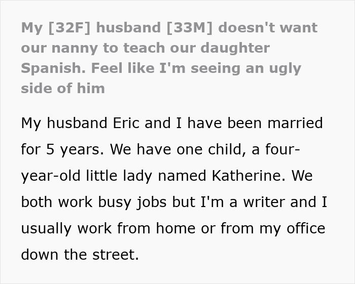 Unfortunately, the poster’s husband didn’t like that his kid had learned Spanish and secretly told their nanny to only talk to the girl in English
