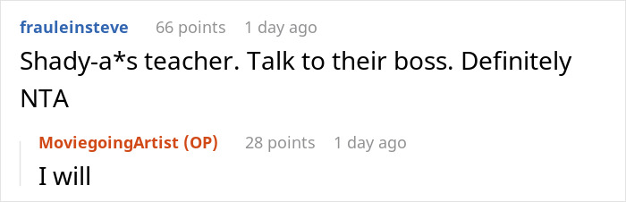 Reddit responded with a resounding NTA and added that the teacher was way out of line