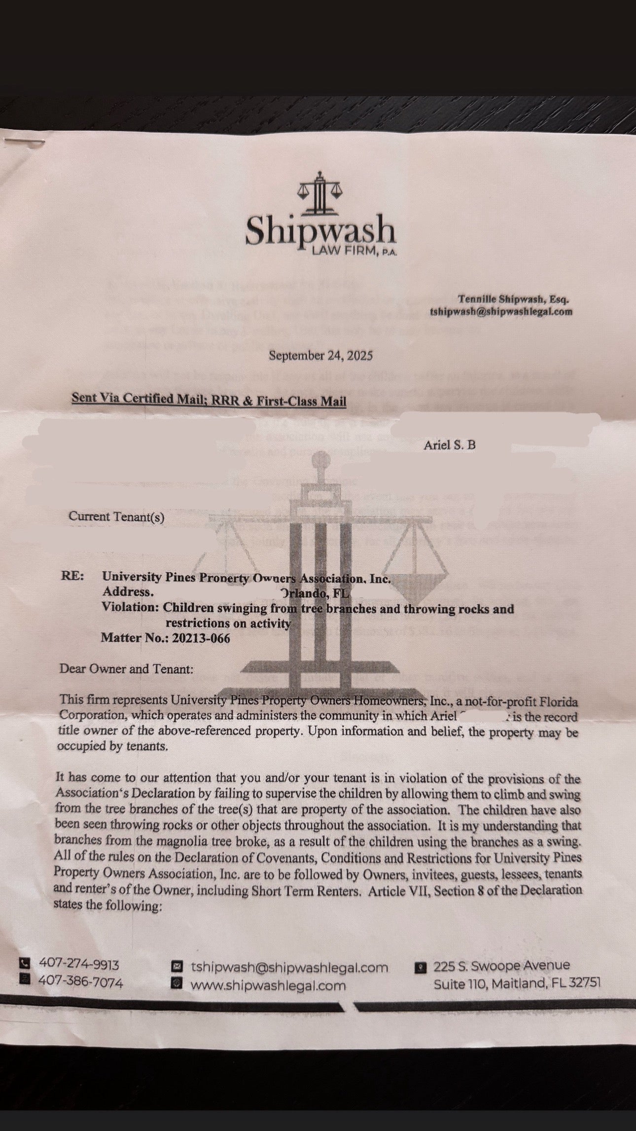 The letter also claims the children have “been seen throwing rocks or other objects throughout the association.” The letter states Barner must comply with the association’s rules and “pay attorney’s fees and costs in the amount of $382.16” to Shipwash Law Firm, which appears to be representing the University Pines Property Owners Association.