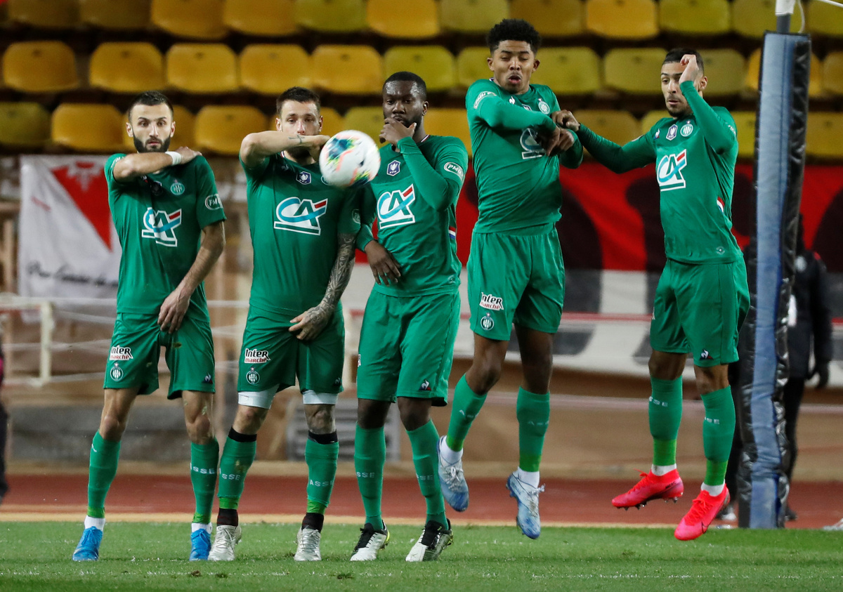 Soccer Football - Coupe de France - Round of 16 - AS Monaco v AS Saint-Etienne - Stade Louis II, Monaco - January 28, 2020 Saint Etienne's Wesley Fofana and teammates defend a free-kick REUTERS/Eric Gaillard