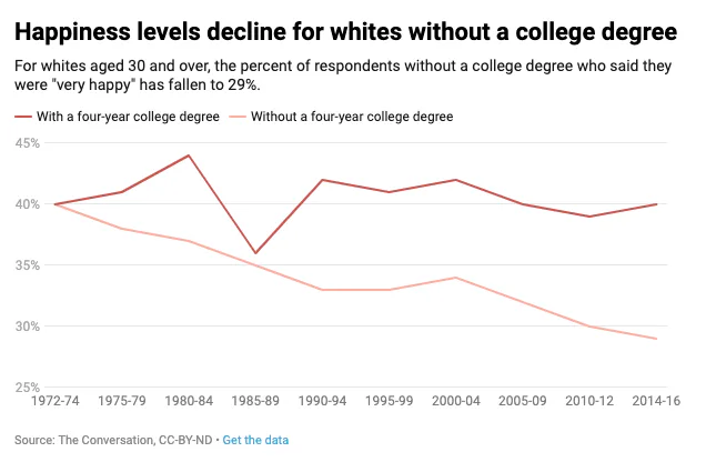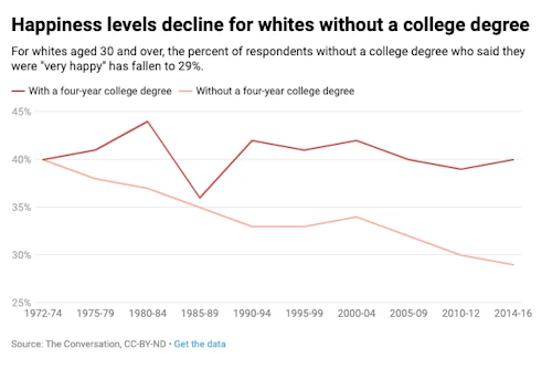 Among white Americans in the 1970s, adults with and without a college degree were equally likely to say they were “very happy” – around 40%. But by the 2010s, there was an education gap in happiness: Only 29% of those without a degree said they were very happy, compared with 40% of those with a degree. The same was true for income: The difference in happiness by income level grew steadily larger from the 1970s to the 2010s.