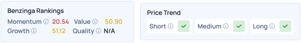 The stock was down 1.88% on Tuesday, closing at $214.34, but is up 29.81% premarket hours, following its second-quarter earnings release. It, however, scores poorly in Benzinga’s Edge Stock Rankings, but has a favorable price trend in the short, medium and long terms. Click here for deeper insights into the stock.