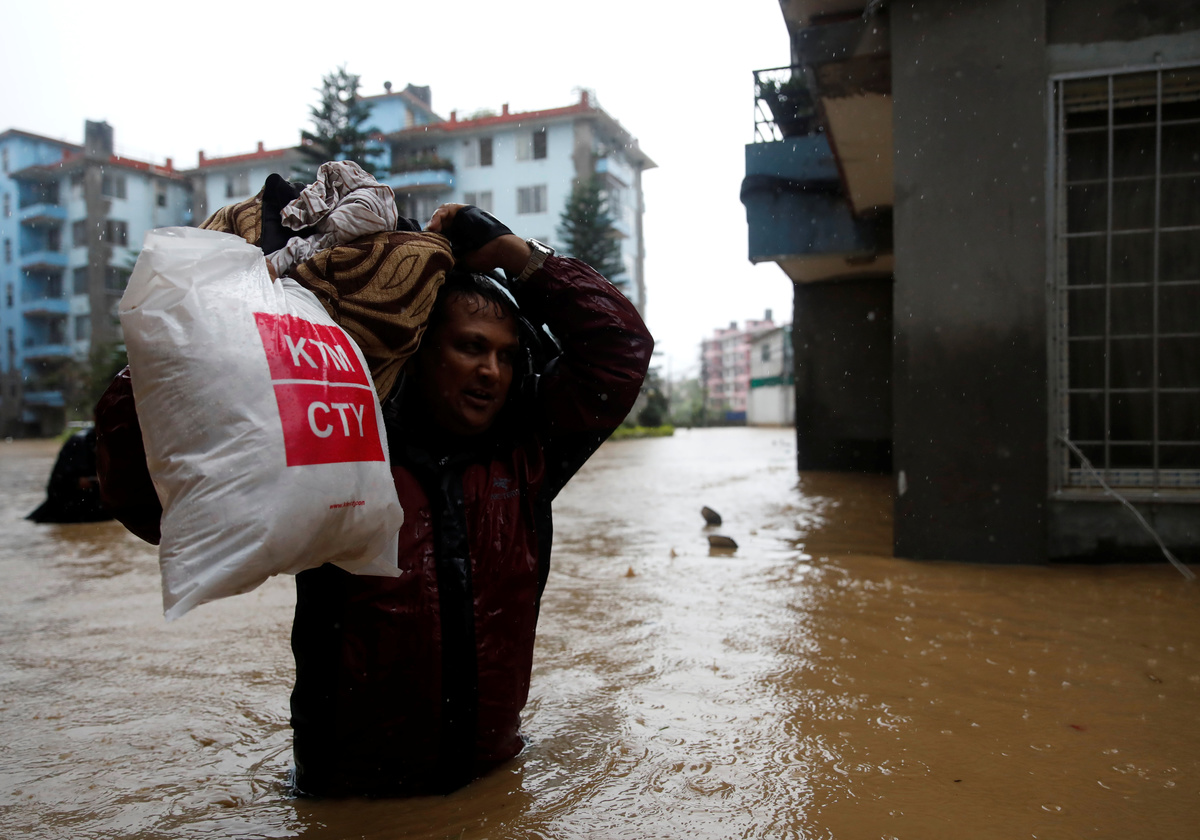 A man carrying his belongings walks towards dry ground from a flooded colony in Kathmandu, Nepal July 12, 2019. REUTERS/Navesh Chitrakar