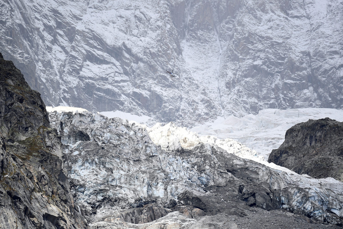 A helicopter flies over a segment of the Planpincieux glacier on the Italian side of the Mont Blanc massif area of Planpincieux, Aosta, Italy, September 25, 2019. REUTERS/Flavio Lo Scalzo