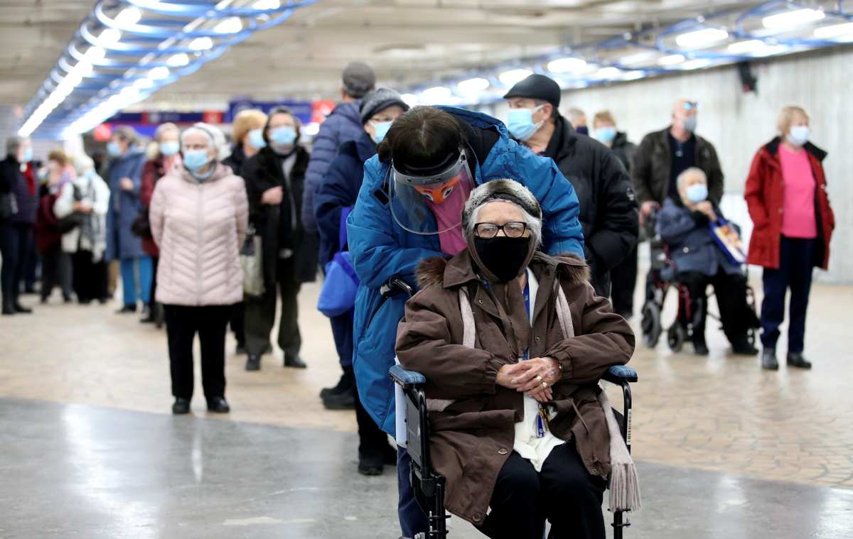 Montreal's cavernous Olympic Stadium, which once hosted young athletes during the 1976 summer games, on Monday saw thousands of octogenarians donning folding chairs and canes as they waited in a snaking line for jabs.