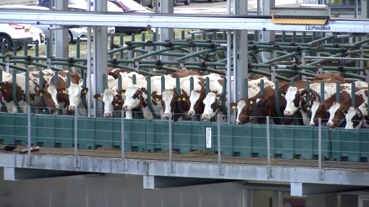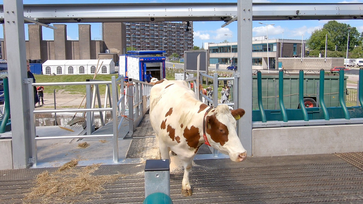 The cows, seemingly unperturbed by their futuristic setting on the fringe of Europe's largest and busiest port, can rest on the upper level of the structure or head to a feeding station for a mix of hay, grass clippings and beer byproducts.