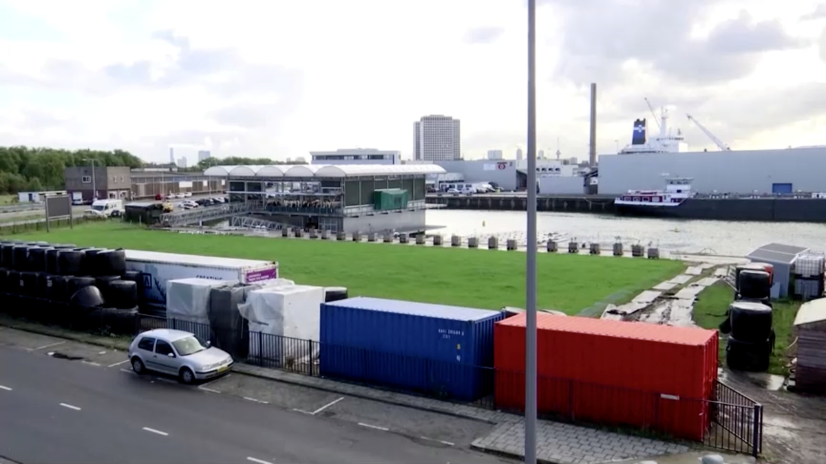 Close to the town of Schiedam, the farm is located in one channel of the "Merwehaven", a harbour within the sprawling 105 square kilometer port, which handles containers ships from all over the world.