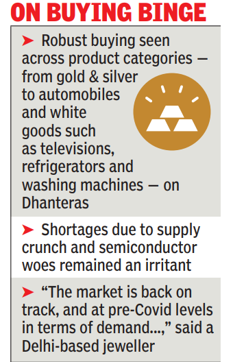 NEW DELHI: After a tumultuous post-Covid period and an unprecedented year-and-a-half since the outbreak of the deadly virus, Dhanteras saw consumers return to the market with vengeance as shopping fervour on the auspicious day regained previous peaks across product categories -- from the customary gold and silver, to automobiles and white goods such as televisions, refrigerators and washing machines.