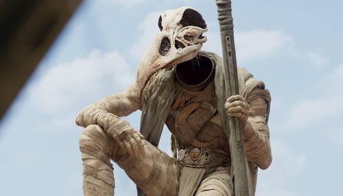He is usually shown as a falcon-headed man, or a young man in a shroud-like garment. In the series, Khonshu is a tall figure commandingly voiced by F Murray Abraham (and performed by Karim el-Hakim), with a terrifyingly large bird skull for a head and carrying a moon-topped staff.
