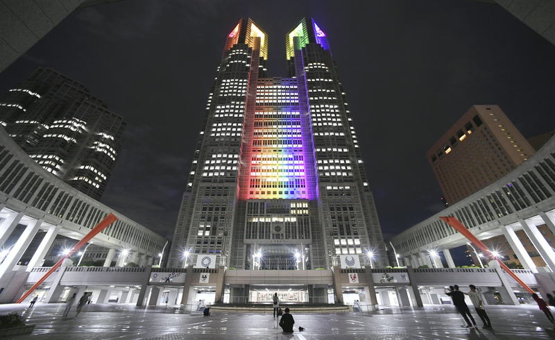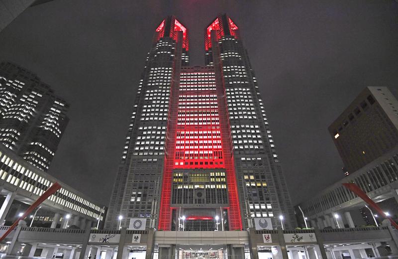 The Tokyo metropolitan government building in Shinjuku Ward and the Rainbow Bridge over Tokyo Bay were lit up in red after the Tokyo alert was issued. From late Thursday, both were illuminated in rainbow colors after the alert was lifted.