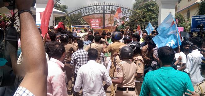 Marches by the Kerala Students Union, Students Federation of India, and Akhil Bharatiya Vidyarthi Parishad reached the college one after another and violence erupted when the police tried to stop them from entering the campus.