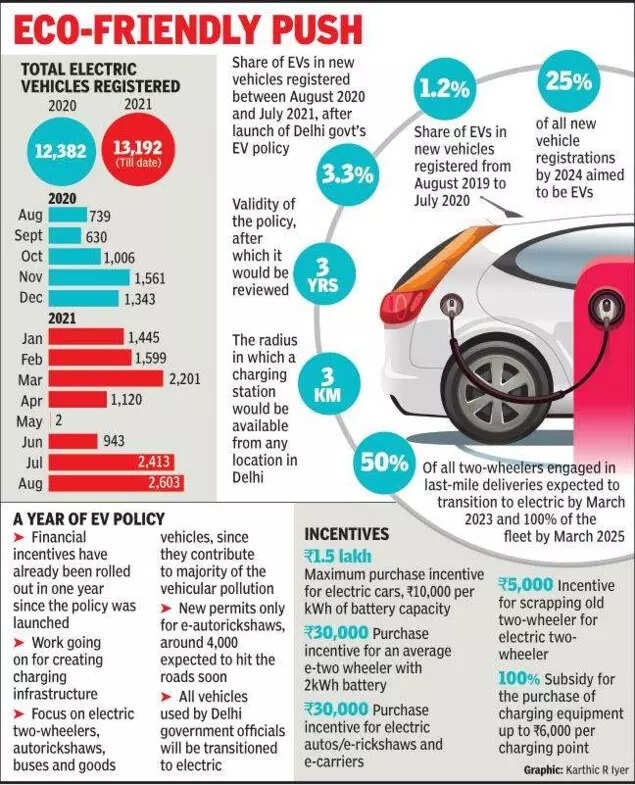 NEW DELHI: On August 7 last year, Delhi government launched its Electric Vehicle (EV) Policy. A total of 739 EVs were registered that month. This August saw 2,603 vehicles being registered as the overall share of this category in new registrations showed a spike. Although overall vehicle registration has gone down since the previous years due to Covid-19, the number of EVs being registered in the city has risen steadily.