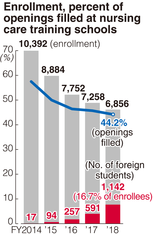 Foreign students account for a sixth of the total figure enrolled, according to a survey by the Japan Association of Training Institutions for Certified Care Workers. While overseas interest in the Japanese nursing care industry is rising, there has been no end to the decline in the number of young Japanese people aspiring to become nursing care workers.