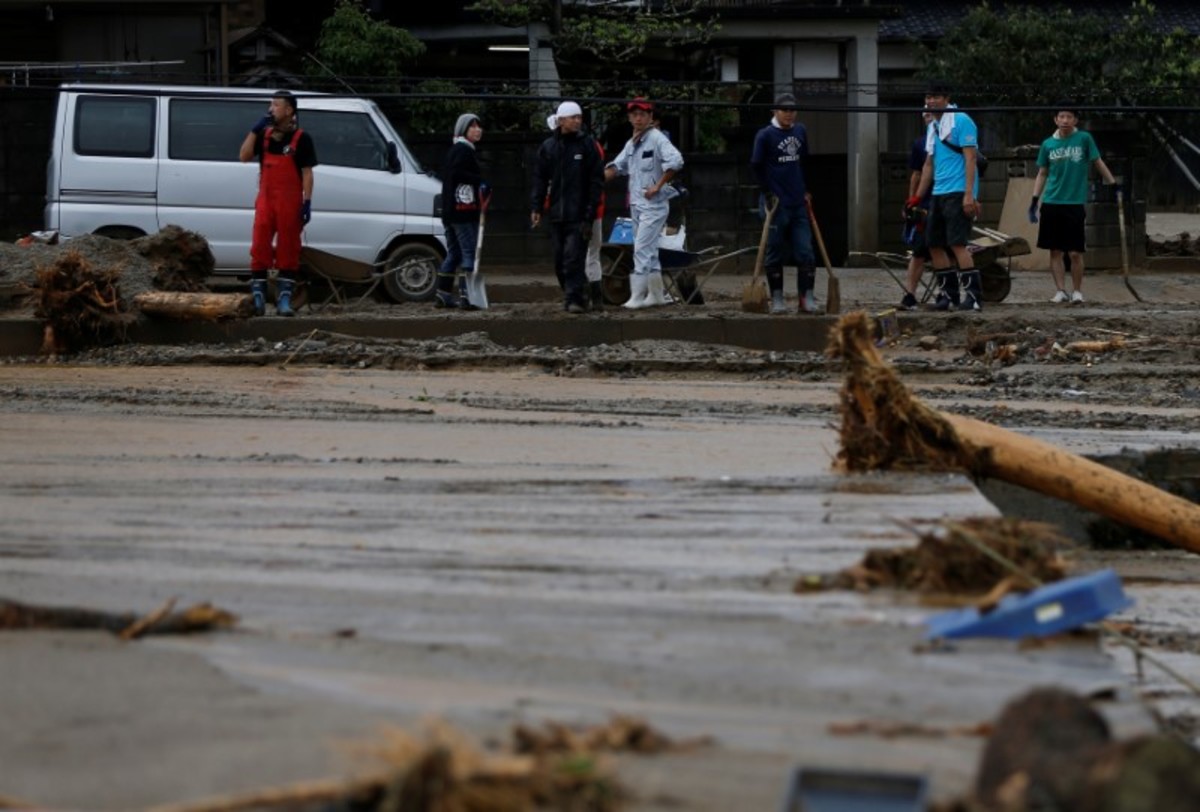 Local residents prepare to remove mud and debris which were swept by heavy rain in Asakura, Fukuoka Prefecture, Japan July 8, 2017. REUTERS/Issei Kato