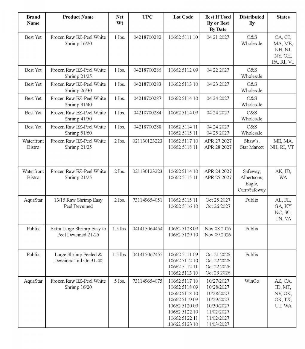 From Best Yet, multiple one-pound packages of the Frozen Raw EZ-Peel White Shrimp are recalled after being distributed by C&S Wholesale grocery stores in the following states: