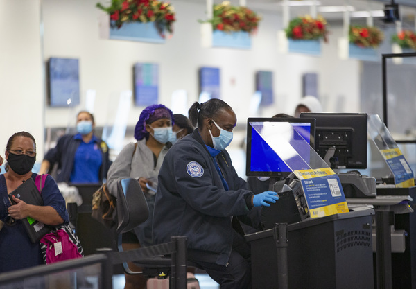 A TSA worker wears a mask while helping travelers get through security checkpoint at Concourse D at the Miami International Airport on Sunday, November 22, 2020 in Miami, Florida. With the coronavirus surging out of control, the nation's top public health agency pleaded with Americans not to travel for Thanksgiving and not to spend the holiday with people from outside their household. (David Santiago/Miami Herald/TNS)