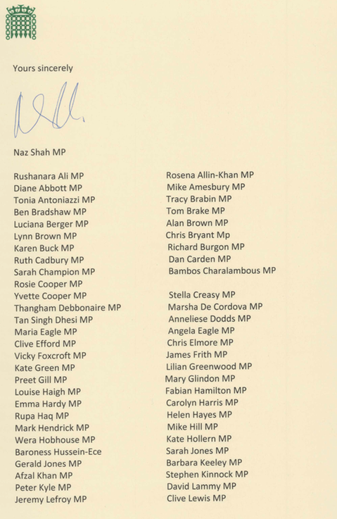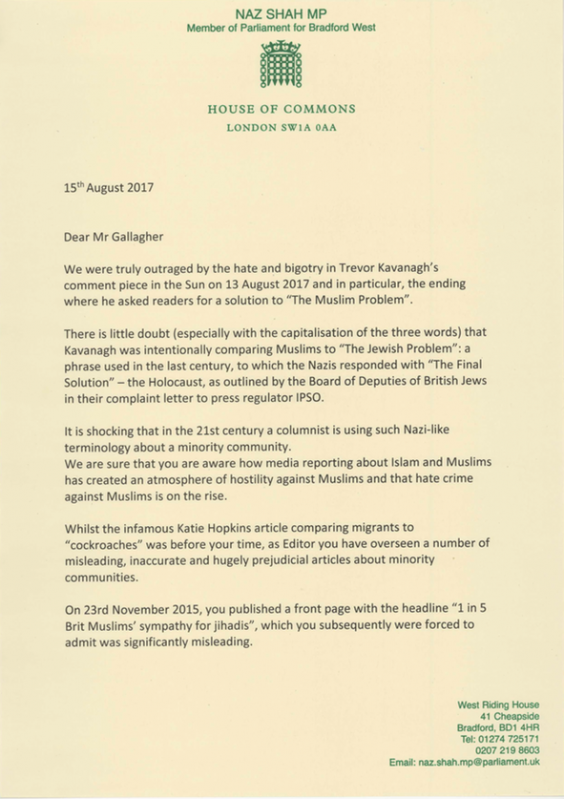 The letter to The Sun’s editor – signed by 107 MPs – was organised by the Labour MP Naz Shah and includes prominent politicians, including former Cabinet ministers Baroness Warsi and Anna Soubry.