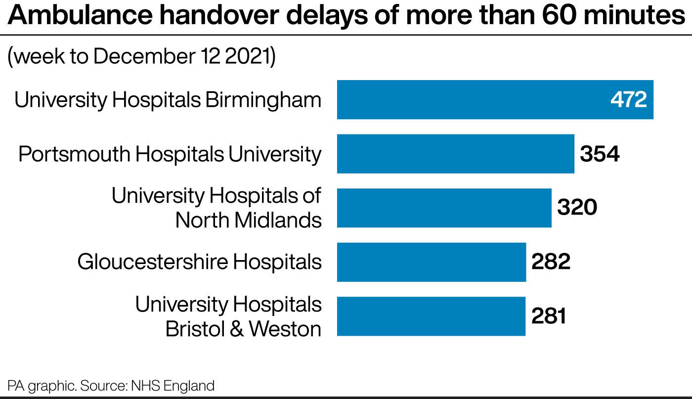 Analysis of the figures by the PA news agency shows that University Hospitals Birmingham reported the highest number for an individual trust in the week to December 12 (472 delays of more than 60 minutes), followed by Portsmouth Hospitals University (354), University Hospitals of North Midlands (320), Gloucestershire Hospitals (282) and University Hospitals Bristol & Weston (281).
