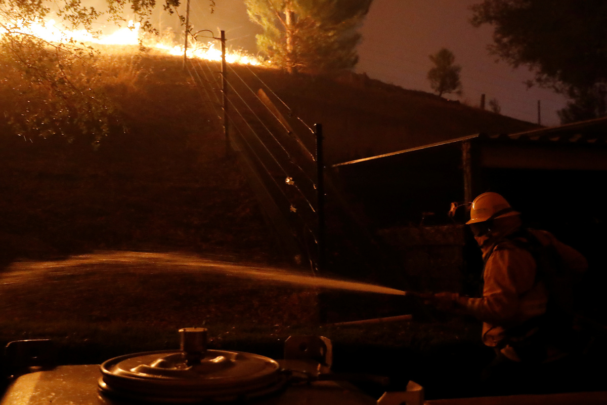 GEYSERVILLE, Calif. (Reuters) - A wind-driven wildfire that forced some 2,000 people to flee homes in Northern California's wine country on Thursday erupted near the base of a damaged high-voltage transmission tower owned by Pacific Gas and Electric Co, utility and fire officials said.
