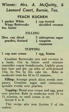 Peach Kuchen, which won the “Busy Lady” section, was made with a packet of White Wings cake mix, a tin of peaches and some sour cream. The Bake-Off helped to popularise (and sell!) boxed cake mixes: even the “busy woman” could create delicious cakes deserving of accolades.